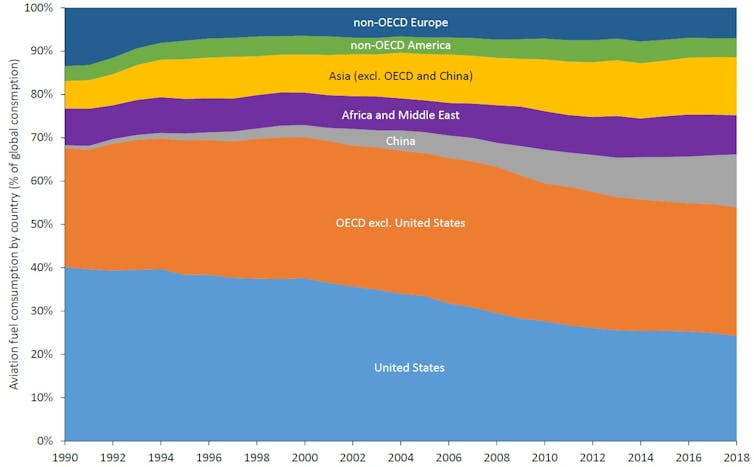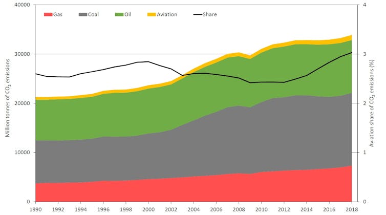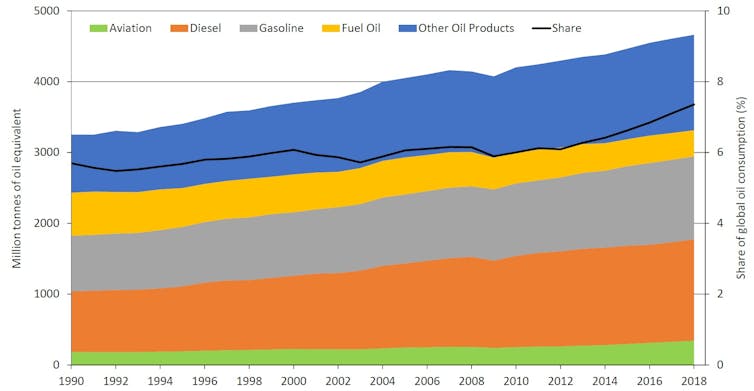 Yet according to our calculations based on the the BP Statistical Review of World Energy 2019 (which we both contributed to), CO₂ emissions from aviation fuels account for a mere 3% of global CO₂ emissions and 8% of worldwide oil consumption. This may not sound like much, but in the past 30 years, aviation fuel consumption has almost doubled, consistently contributing to the growth in global oil consumption.